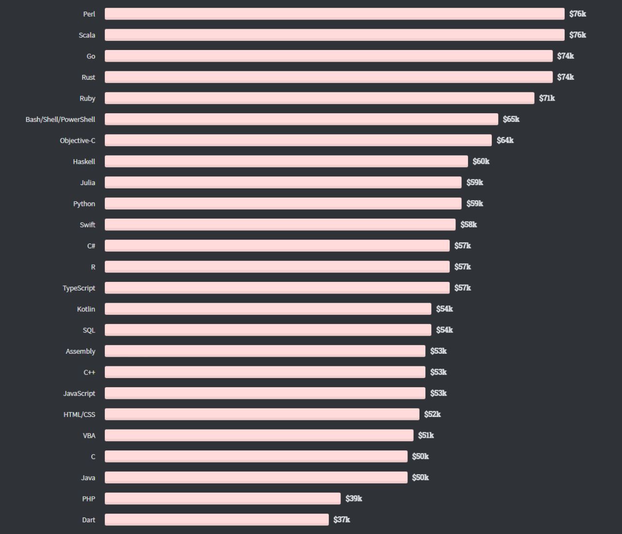 علاوه بر این، داشتن دانش عمیق در مورد یک زبان برنامه نویسی خاص میتواند به یافتن کار مناسب کمک کند. اگر بحث دستمزد را مدنظر قرار دهیم، در زیر پردرآمدترین زبانهای سال گذشته ارائه شدهاند.