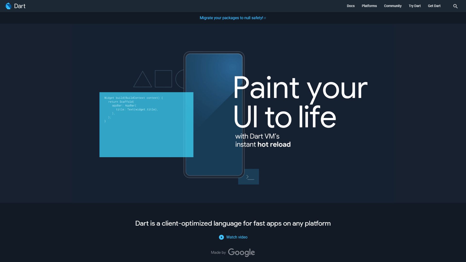 دارت یک زبان برنامه نویسی بهینه شده برای برنامهها در چندین پلتفرم است. این زبان توسط گوگل ساخته شده و برای ایجاد برنامههای موبایل، دسکتاپ، سرور و وب استفاده میشود. دارت یک زبان شی گرا و کلاس محور با سینتکس سبک C است. این زبان میتواند به کد بومی یا جاوااسکریپت کامپایل شود.
