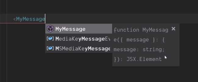 وقتی که ما میرویم تا از این کامپوننت استفاده کنیم، میتوانیم ببینیم که VS Code نشانه کامپوننت را همانطور که تایپ میکنیم، بالا میآورد. نیازی نیست که به کامپوننت بازگردیم (مخصوصا اگر در یک فایل دیگر است) تا ببینیم ورودیاش چه باید باشد.