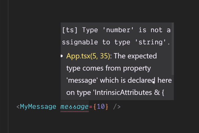 اگر یک عدد را به عنوان یک پیام اضافه کنیم، TypeScript یک خطا را بروز خواهد داد و به ما کمک خواهد کرد تا این باگهای تایپ کردن را بگیریم.