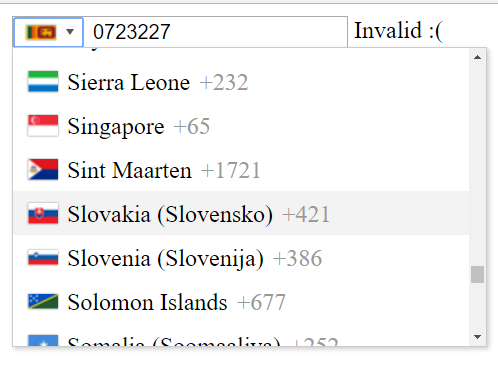 - شما یک فیلد ورودی کشور اختصاصی فراهم میکنید (براساس همان کد کشورها) تا خود کاربر اختیار داشته باشه که کشور مورد نظرش رو انتخاب کنه. ساده ترین راه نصب پکیج Laravel-Intl هست. مطمئن بشید که فیلد کشور همنام فیلد تلفن هست اما یک عبارت country_ به نامش اضافه شده باشه که بصورت خودکار شناسایی بشه, یا اینکه نام سفارشی فیلد کشور رو بعنوان پارامتر در اعتبارسنج وارد کنید :