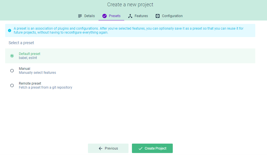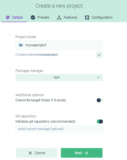 با انجام چنین کاری شما باید اطلاعاتی را درباره پروژه وارد کنید. نام پروژه، پکیج منیجر، قابلیت پیادهسازی گیت برای پروژه و… .