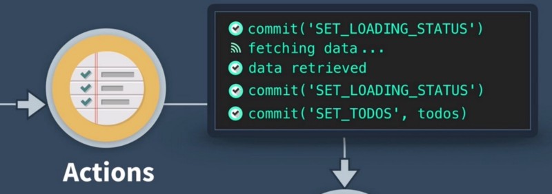 در اینجا میتوانید ببینید که ما action با نام fetchTodo را اعزام میکنیم، و این توزیع جهش SET_LOADING_STATUS را متعهد به انجام کاری میکند، که state را تغییر میدهد.