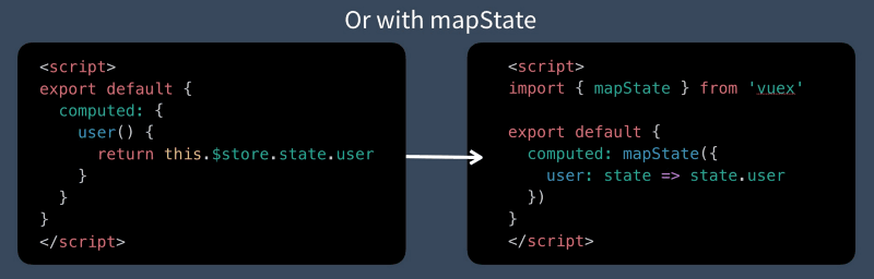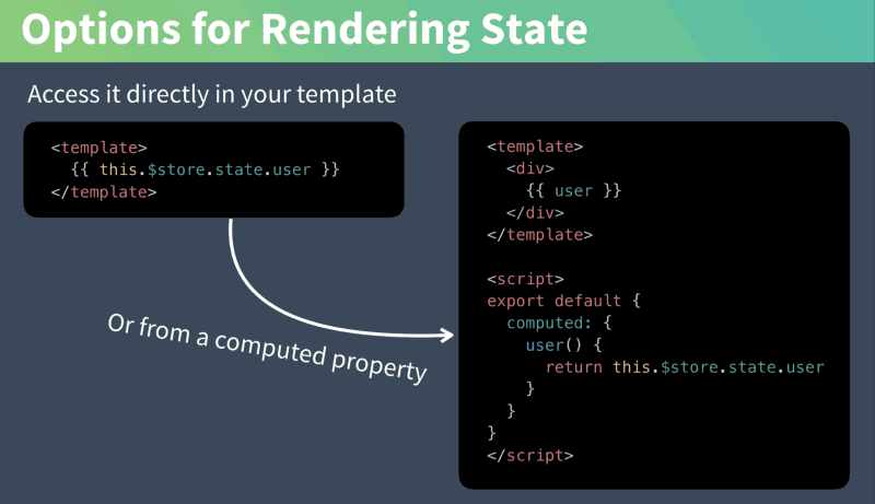سادهترین راه برای دسترسی به Vuex state از یک فایل با فرمت .vue است، که در زیر (در سمت چپ) نمایش داده شده است، گرچه شما همچنین میتوانید آنها را داخل ویژگیهای محاسبه شده قرار دهید تا نحووه نوشتن آنها در الگو را سادهسازی کنید. (که در سمت راست نشان داده شده است)