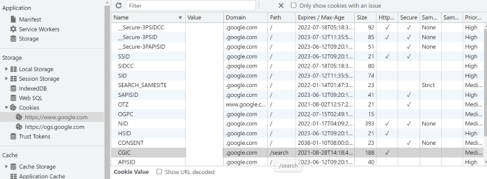 میتوانید همه کوکیهای ذخیره شده در مرورگر خود را در محل ذخیره سازی کوکیها با استفاده از ابزار dev پیدا کنید.