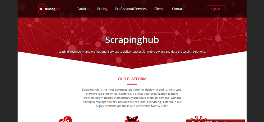 این یک پلتفرم بسیار پیشرفته در زمینه کرال کردن با استفاده از "اسپایدرها" است. چنین پلتفرمی شما را قادر میسازد تا کرالرهای متعددی را به طور همزمان راهاندازی کنید. برای این کار شما نیازی به نظارت داشتن بر روی اتفاقات پس زمینه ندارید. شما تنها دادههای لازم را به آن میدهید و بقیه کارها را خودش به تنهایی انجام خواهد داد. همه چیز در دیتابیس Scrapinghub ذخیره میشود و به راحتی از API ما قابل بازیابی است.