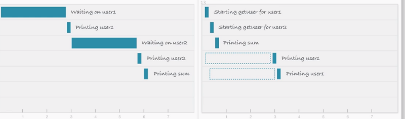 در سمت دیگر و هنگام استفاده از یک درخواست بدون مسدود کردن، میتوانید یک درخواست داده را برای کاربر ۲، بدون منتظر ماندن برای پاسخ کاربر ۱ آغاز کنید. همچنین میتوانید هر دو درخواست را به صورت موازی آغاز کنید.
