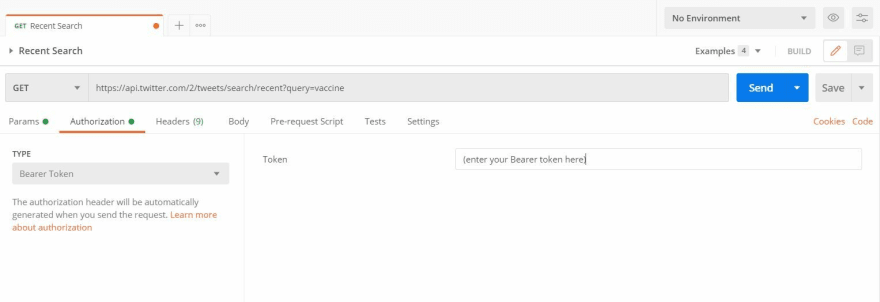 مرحله 2 - روی تب authorization کلیک کنید و حین ایجاد حساب کاربری توییتر خود، Bearer Token را همانطور که برای پروژه شما ارائه شده است وارد نمایید.
