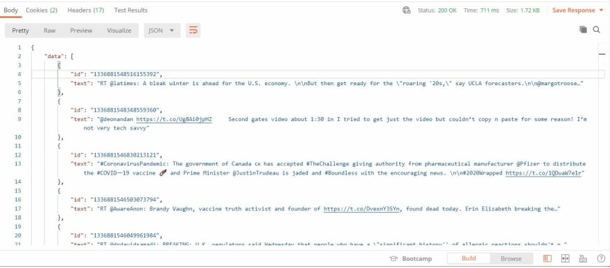 تبریک میگویم شما اولین درخواست API خود را انجام دادید. در صورت تمایل میتوانید خودتان با این API بیشتر کار کنید و همچنین برای کسب اطلاعات بیشتر در مورد استفاده از Twitter API به این لینک مراجعه کنید.