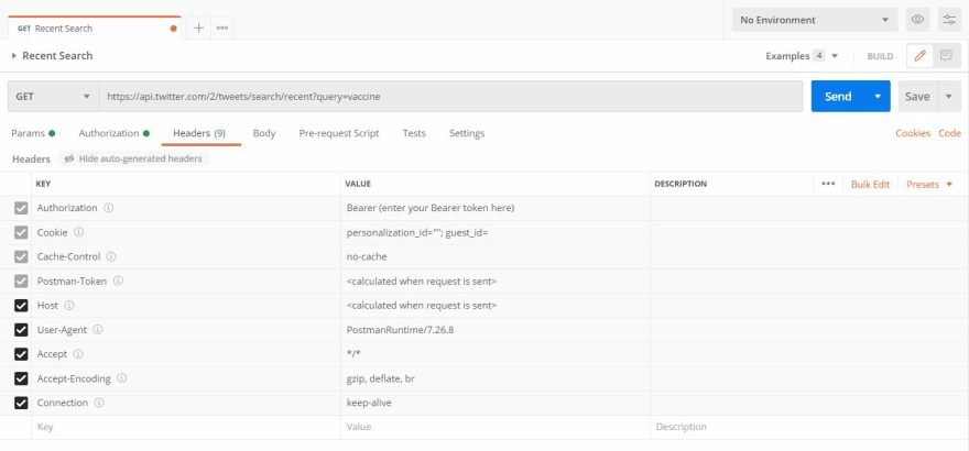 مرحله 3 - مطمئن شوید که فیلدهای زیر را در تب Headers خود دارید. قسمت مجوز حاوی نشان دهندهBearer شما است و کوکی حاوی personalization_id و guest_id خواهد بود که مختص شما میباشد.
