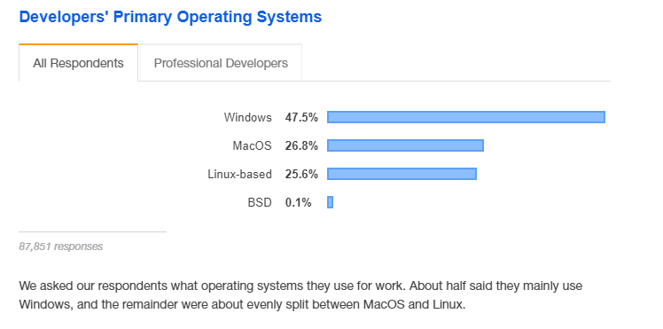 طی یک نظرسنجی در Stack Overflow، از 80 هزار توسعهدهنده نیز همین سوال پرسیده شد و آنها ویندوز را پرکاربردترین سیستم عامل دانستند.
