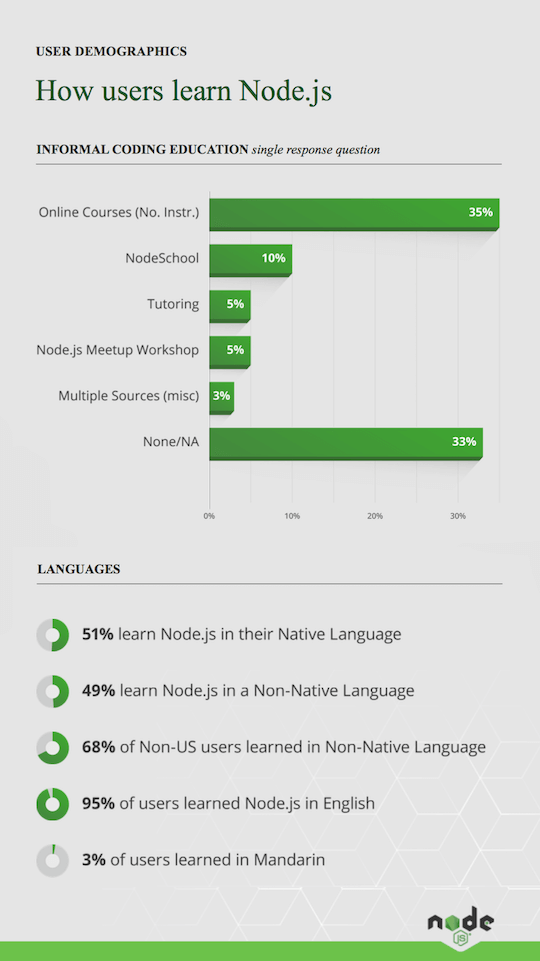 نتایج نظرسنجی نشون میده اکثر توسعه دهندگان دانش خودشون رو با استفاده از دوره ها و منابع آموزشی آنلاین بهبود دادند و همچنین NodeSchool بسیار محبوب است.