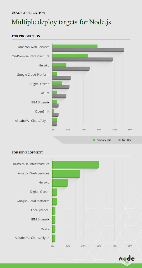 این نظرسنجی به میگه که توسعه دهندگان Node چه نوع استقراری (deployment) رو انتخاب می کنند. نتایج نشون میده AWS محل اصلی استقرار برای اجرای اپلیکیشن های Node.js در مرحله تولید است - اما به نظر میرسه که زیرساخت های on-premises یا self-hosted هم به خوبی محبوب هستند.