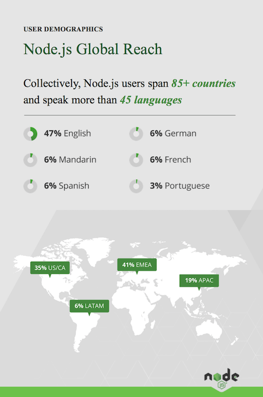 Node نه تنها بخش های سازمانی بلکه تمام جهان رو هم تسخیر کرد. به طور خلاصه کاربران Node.js در بیش از 85 کشور قرار دارند و بیش از 45 زبان صحبت می کنند.