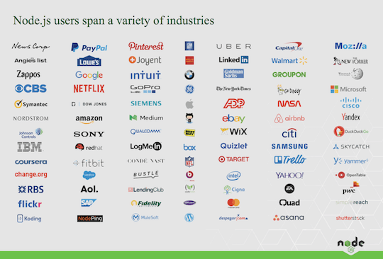 از زمانی که Node.js شامل LTS (برنامه پشتیبانی بلند مدت که روی امنیت و پایداری تمرکز میکنه) شده یعنی از 2015, جای تعجب نیست که سازمان های بزرگ به صورت مداوم اون رو در حوزه کاری خودشون قرار دادن.