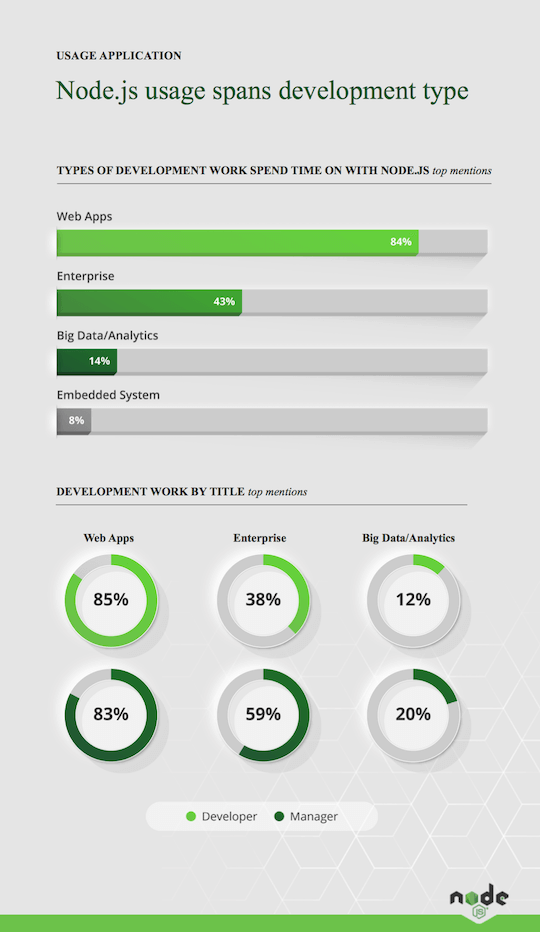 نتایج نشون داد که Node.js در درجه ی اول برای ساخت اپلیکیشن های وب استفاده میشه اما همچنین ما دیدیم که Node انتخاب محبوبی برای ساخت اپلیکیشن های سازمانی هم هست.