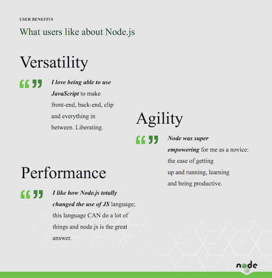 "رشد Node.js در بین کمپانی ها یک عهد برای گوناگونی پلتفرم هاست. این فراتر از صرفا یک پلتفرم اپلیکیشن است و در حال استفاده برای آزمایشات سریع با داده های جامع, مدرن سازی اپلیکیشن ها و راه حل های IoT است." منبع