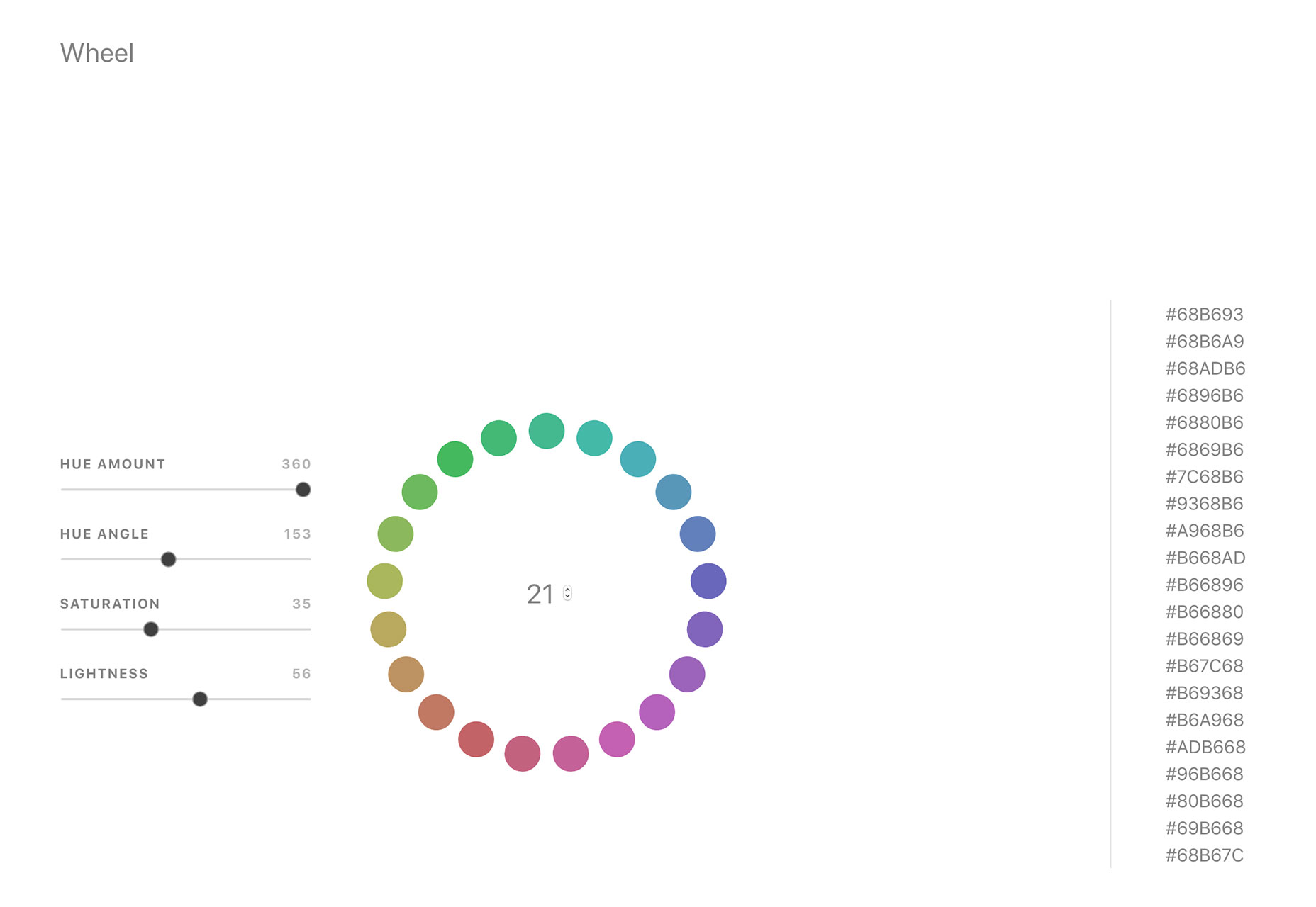 Color Wheel Generator، تطابقهای بی نقصی از رنگها، برگرفته از چرخ رنگ در فرمت HEX برای شما فراهم میکند. تنظیماتی مانند رنگ، زاویه، اشباع و روشنایی را تنظیم کنید، و تطابقهای عالی از نقاط مختلف چرخ را ببینید.