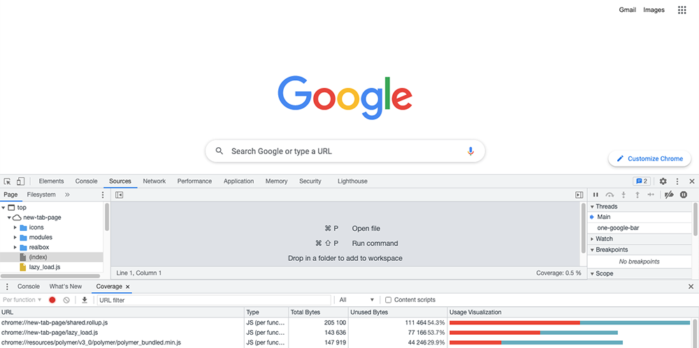 از طرف دیگر میتوانید از تب Coverage در پنل DevTools کمک بگیرید تا دادههای مربوط به اسکریپتهایتان را به شما نشان دهد. هنگامی که تشخیص دادید کدام اسکریپتها کمتر از حد مطلوب هستند، میتوانید چند کار برای رفع آنها انجام دهید. هرچند این مراحل برای اجرای موفقیتآمیز، کمی به مهارت کدنویسی نیاز دارند. پس حداقل باید یک درک اولیه از برنامه نویسی کاربردی جاوا اسکریپت داشته باشید.