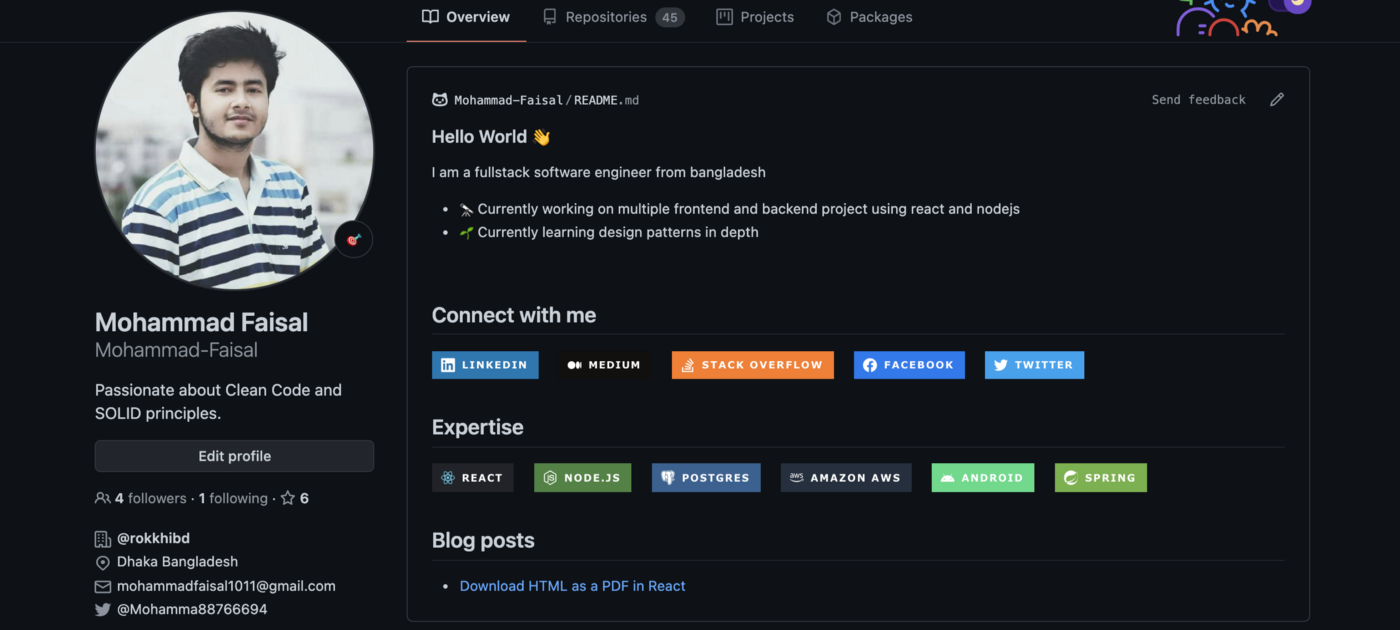 گیتهاب یک مکان عالی است که در آن پروفایلتان میتواند به نفع شما کار کند. کمی وقت بگذارید و پروفایل خود را به درستی تزئین کنید. میتوانید در تصویر پایین، پروفایل من را مشاهده کنید.